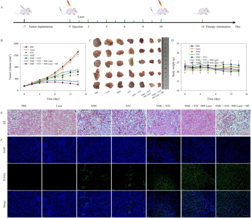 基于光热/光动力学的治疗方法是一种新兴的肿瘤治疗策略。然而,由于肿瘤微环境的缺氧、内源性H2O2水平低等特性,肿瘤的治疗效果并不明显。本文开发了一种多重抗肿瘤纳米反应器,由双金属有机框架(Zn/Co-MOF)、二甲双胍、顺铂、吲哚菁绿(ICG)、1-甲基色氨酸(1-MT)和Mxene制备。构建的纳米反应器通过适配体和磁效应靶向肿瘤细胞。在肿瘤微环境中,NMC可高效消耗内源性葡萄糖,通过GOD介导的糖代谢反应产生H2O2和葡萄糖酸,诱导肿瘤的“饥饿”治疗。反应生成O2和1O2,可以有效改善肿瘤的缺氧环境,降低对PDT的耐药性。释放的二甲双胍可阻断糖酵解反应,导致细胞凋亡,并可以通过内质网相关的PD-L1降解逆转肿瘤免疫抑制从而增强免疫反应。同时,二甲双胍也可阻碍氧气消耗并提高氧气含量以提高GOD的催化效率。在激光照射下,温度在肿瘤部位急剧增加,Nb2C和ICG可以产生光热效应,这可以导致肿瘤细胞凋亡,达到显著的PTT效应。数据显示,联合使用NMC和NTC可以触发免疫反应,产生有效的免疫治疗效应。