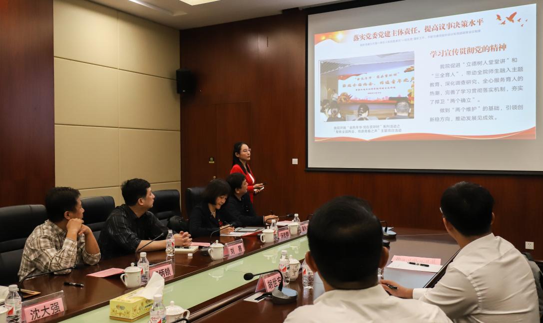 学院党委副书记、纪委书记吴达慧从落实主体责任、意识形态管理、党建发展引领、基层组织完善、推动改革建设五个方面介绍学院党建工作情况,重点展示学生党建的特色,突出“党建+学生成才”的培养模式亮点。