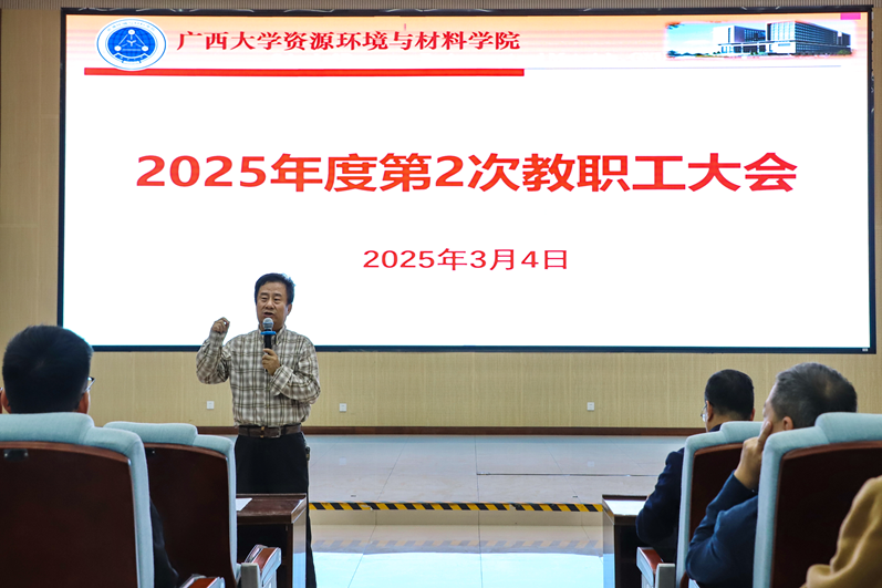 沈大强传达了开学期间学校的相关决策部署和战略研讨会的相关情况,总结了学院2024年工作情况,分析了当前学院发展面临的形势与问题,动员部署了2025年主要工作任务。强调要抓好理论学习,打牢政治根基,把习近平总书记关于教育的重要论述、《教育强国建设规划纲要(2024-2035年)》和全国两会精神落到教学科研实处,扎实落实“实干为要”的工作要求;要夯实党的执政基础,落实全国、全区教育大会精神,推动党建促发展,充分发挥支部、党员的作用;要扎实抓稳师德师风建设,守好清正廉洁育人底线,加强教风、作风、学风一体化推进工作;要抓好教学基本工作,确保本科生、研究生教学工作平稳有序,努力提高教学质量;要聚焦服务国家战略和广西经济建设,助力新质生产力加速发展,利用人工智能赋能教学科研,提升学科影响力;要加强全面安全教育,落实预防为主、早抓早小的隐患排查工作机制,共建和谐平安校园,在新的一年中争创更好佳绩。