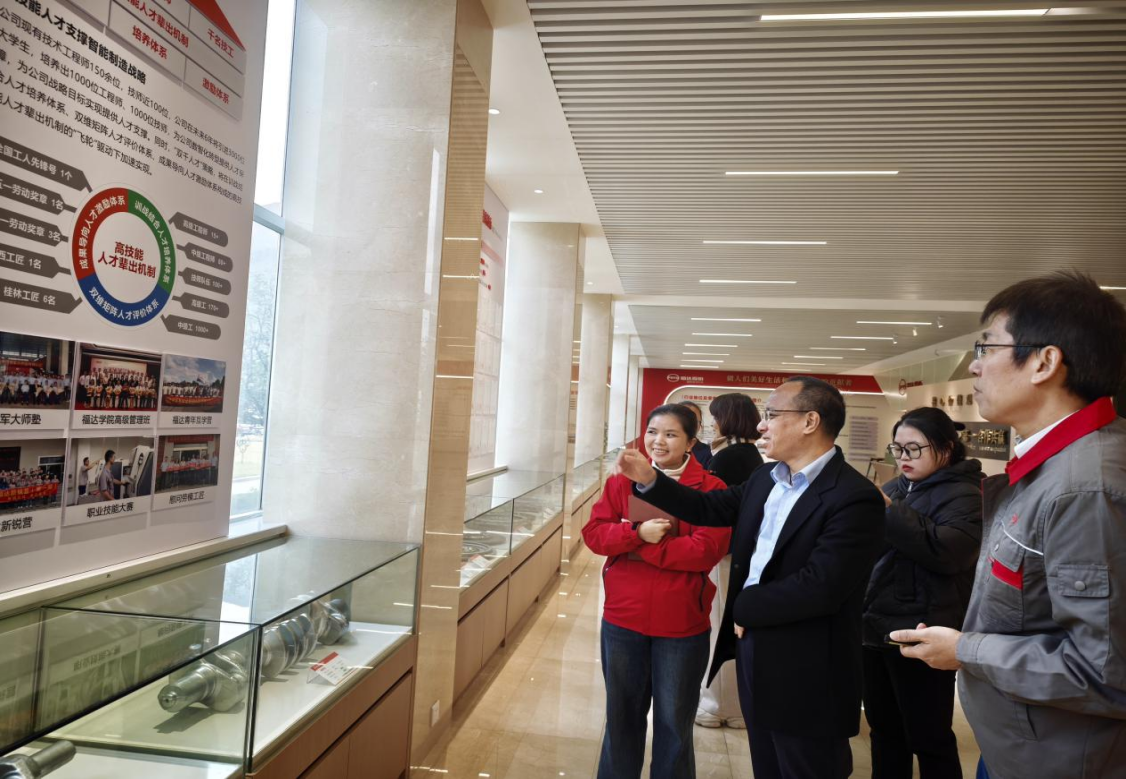福达公司党委副书记、副总经理张海涛,福达学院副院长凌秋露及人力资源部经理唐凌雁予以热情接待。双方参观了企业展厅与智能制造生产线,深入了解发展历程与核心产品,现场观摩精密零部件自动化加工流程,实地感受制造业数字化、绿色化转型实践。