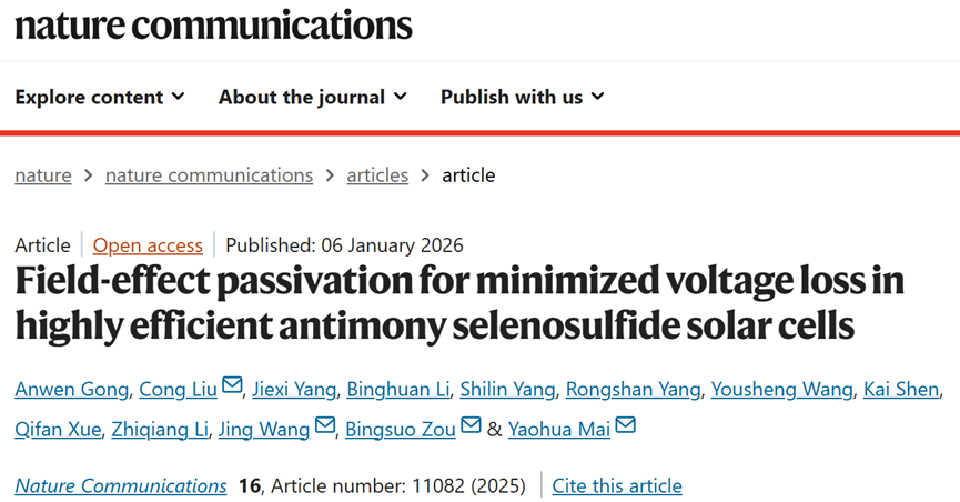 邹炳锁教授领衔的纳米光子学材料与技术团队在硒硫化锑(Sb2(S,Se)3)太阳电池领域取得新进展,相关成果以“Field-effect passivation for minimized voltage loss in highly efficient antimony selenosulfide solar cells”为题,发表在国际顶级期刊自然通讯 (Nature Communicatios)。资环材学院2025级博士研究生龚安稳为第一作者,邹炳锁教授、刘聪助理教授、暨南大学麦耀华教授和广东工业大学王晶副教授为共同通讯作者,快看漫画