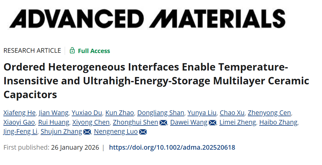罗能能教授团队在电介质陶瓷材料领域实现重要突破,成功开发出兼具高储能密度和高温度稳定性的复合电介质陶瓷,并研制出多层陶瓷电容器(MLCCs)。相关研究成果于2026年1月26日以《Ordered Heterogeneous Interfaces Enable Temperature-Insensitive and Ultrahigh-Energy-Storage Multilayer Ceramic Capacitors》为题发表在《Advanced Materials》上 (//doi-org-s.vpn.kuaikancomic.org:8118/10.1002/adma.202520618)。快看漫画