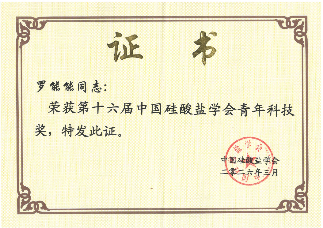 中国硅酸盐学会成立于1945年3月19日,是全国性、学术性、非营利性社会组织,具有社会团体法人资格,是中国科学技术协会的组成部分。中国硅酸盐学会青年科技奖由中国硅酸盐学会邀请相关业内专家评审,经过形式审查、专家评议、投票等环节最终授奖,旨在鼓励无机非金属材料领域青年科技工作者奋发进取,促进本学科青年科技人才成长,奖励在无机非金属材料领域做出突出贡献的青年科技人才,促进我国无机非金属材料学科的创新与发展。该奖项每两年评选一次,此次全国共有12位青年科研人员被授予中国硅酸盐学会青年科技奖,6人获得提名奖。