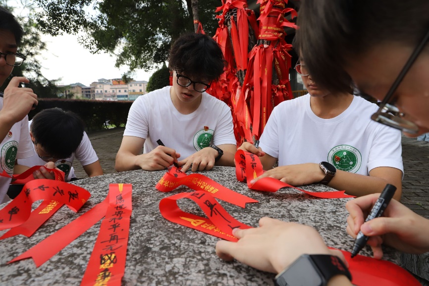 实践团师生在红飘带书写寄语礼敬革命先烈