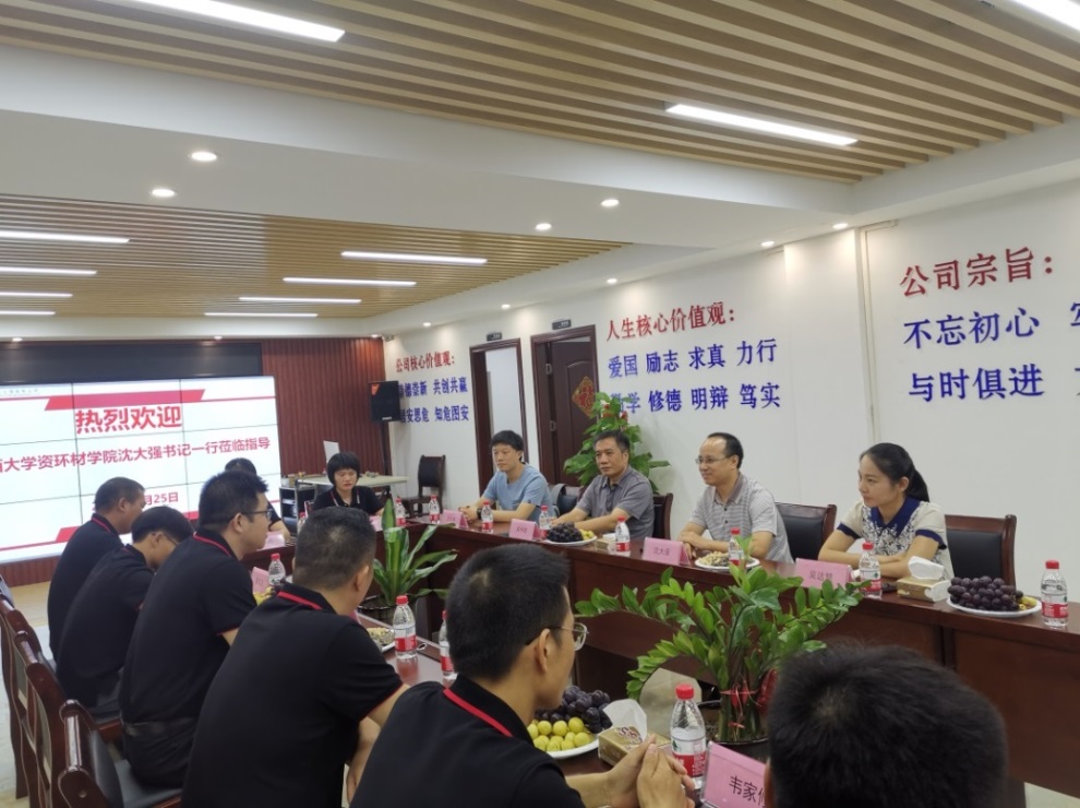 来到校友企业,双方首先进行座谈交流。钟芳杰董事长介绍了公司创业历程、业务开展情况、企业规划和发展理念,并表示一如继往地关心学院发展,为学院人才培养和毕业生就业提供支持。陆安丛总经理和其他校友也纷纷发言,汇报自己工作生活情况,分享各自的创业成长感悟,都特别感恩母校,感恩老师,都表示作为一名西大学子而自豪,能拥有矿物资源工程专业的知识与技能而自豪。
