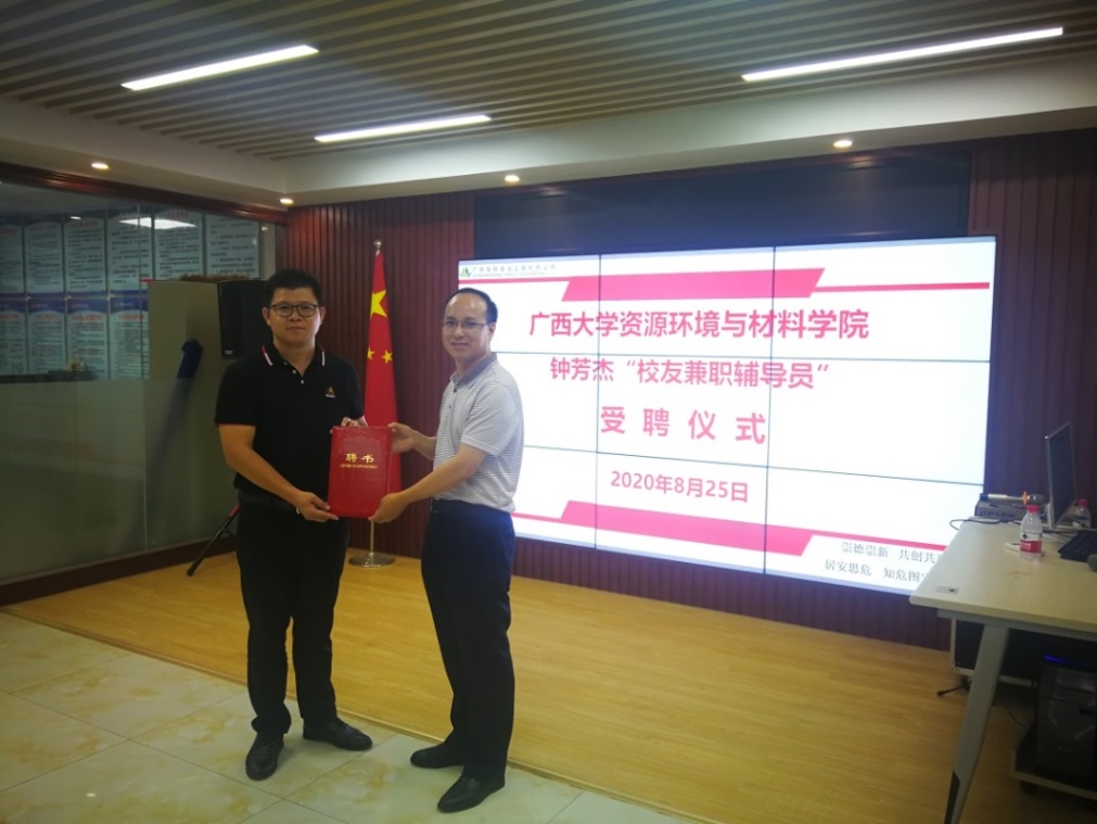 “校友兼职辅导员”该公司董事长钟芳杰颁发聘书。