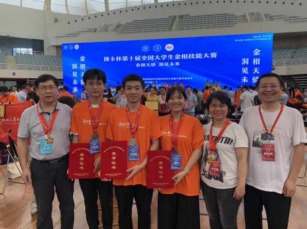 韦炳糊(左三)与委员会老师、领队老师、获奖学生的合照