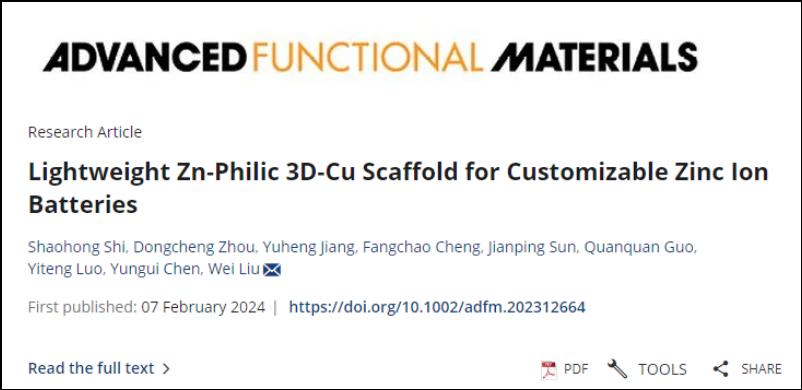 石绍宏老师在3D打印水系锌离子电池研究领域取得重要进展,研究成果以“Lightweight Zn-philic 3D-Cu Scaffold for Customizable Zinc Ion Batteries”为题,发表在SCI杂志《Advanced Functional Materials》(中科院1区,IF =19.0)上。论文第一作者为快看漫画