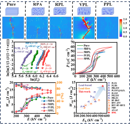 针对上述问题,受自然界天然珍珠层结构启发,研究团队创新性提出一种构建类似有序珍珠层状结构提高击穿强度和储能密度的策略:即在反铁电陶瓷基体中引入具有高击穿强度的Al2O3片状模板,并通过流延技术使Al2O3片有序平行排列,从而构建了“序构化”的反铁电复合陶瓷。研究发现,平行排列的Al2O3片状模板有效阻碍了电荷迁移以及电树击穿路径的发展,将复合陶瓷的击穿强度提高了1.5倍。这种独特的显微结构使陶瓷的储能密度高达13.2J/cm3,远优于常规结构的陶瓷的储能密度。该研究为面向储能电容器应用的高性能电介质陶瓷的设计提供了一种创新方法。