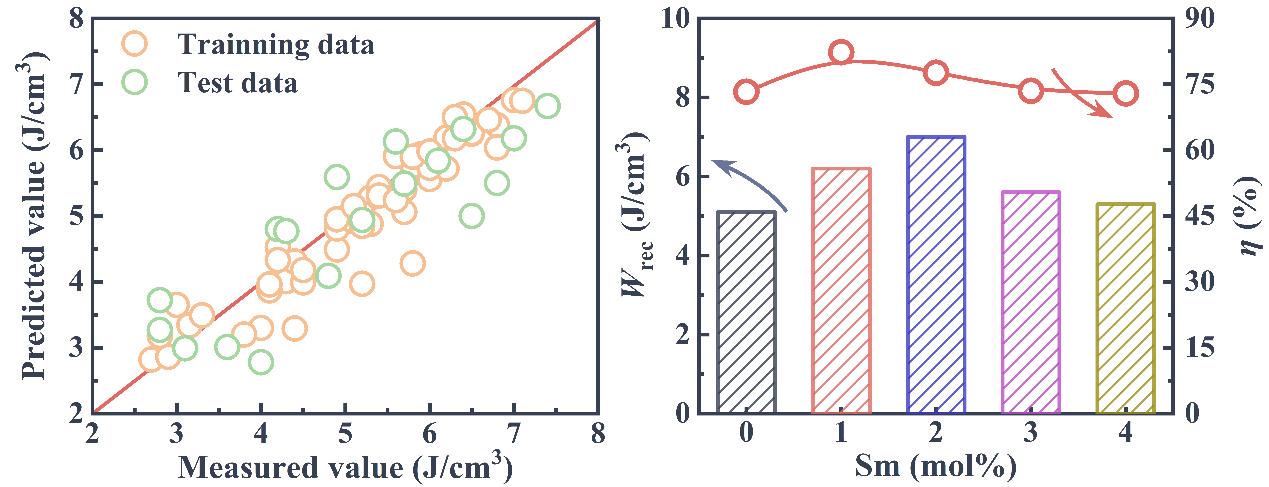 电介质电容器因其高功率密度、良好的可靠性和超快的充放电速率,在大功率储能系统中起着重要的作用。随着电子技术与设备的快速发展,脉冲功率型电介质电容器迫切要求向小型化和集成化方向发展,而制约其发展的主要因素就是目前的电介质材料的储能密度低。目前高性能电介质材料的研发大多数是根据现有的经验和物理知识,在大量实验的基础上获得。然而,这些工作在巨大的成分空间中仅占据很小的部分,使得新材料的发现犹如大海捞针一般。针对上述问题,课题组提出采用机器学习这一新型的科学范例来简化与指导实验,以实现材料的快速筛选和性能优化。