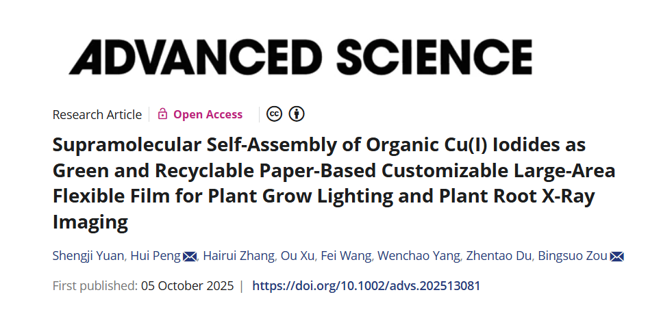 该团队通过超分子自组装策略,成功开发出一种基于滤纸和有机铜碘化物的可定制、大面积、可回收、可生物降解的柔性发光薄膜,并成功构建了一个集植物生长照明与植物根部X射线成像于一体的双功能平台。该研究成果以题为《Supramolecular Self-Assembly of Organic Cu(I) Iodides as Green and Recyclable Paper-Based Customizable Large-Area Flexible Film for Plant Grow Lighting and Plant Root X-Ray Imaging》发表于国际顶级学术期刊《Advanced Science》(IF = 14.1),彭辉博士和邹炳锁教授为共同通讯作者,硕士研究生袁升记为第一作者。快看漫画