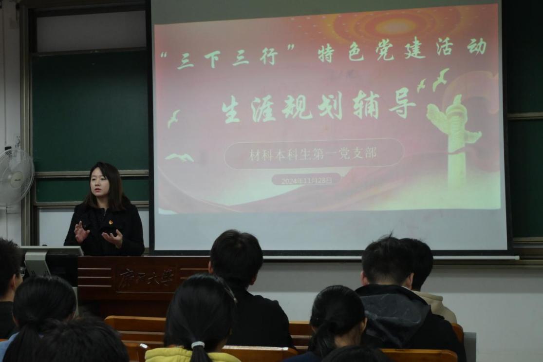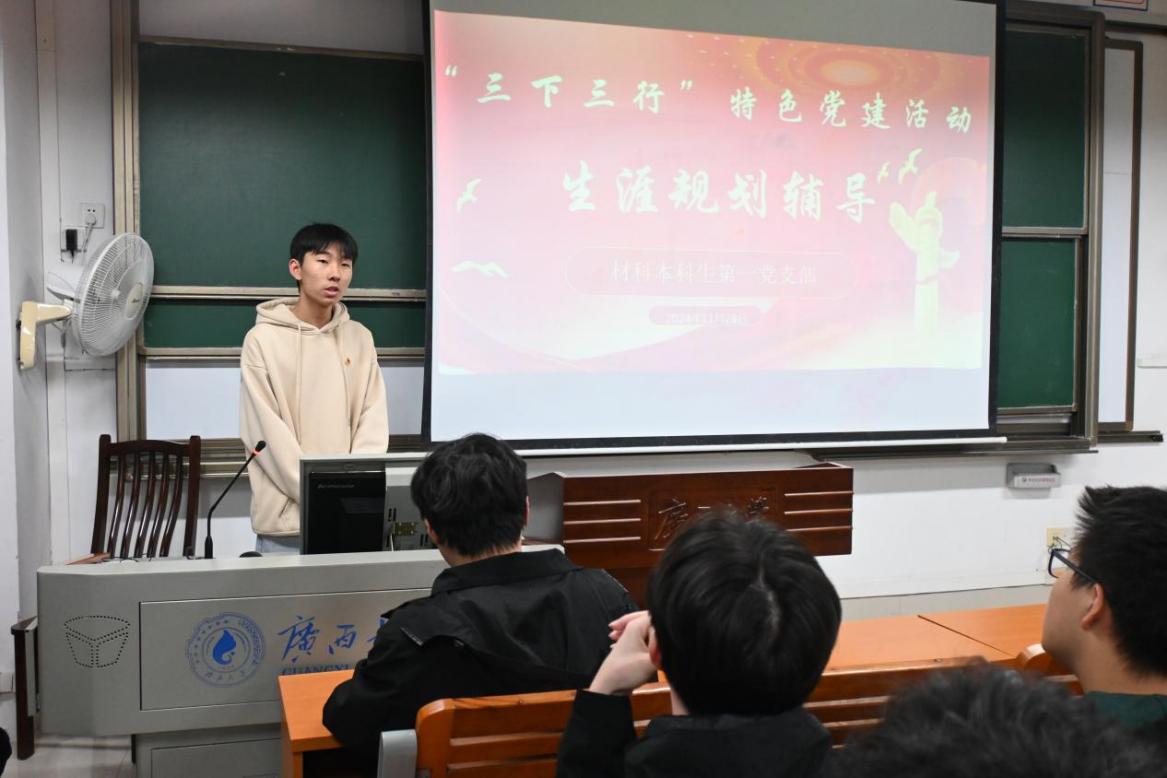 材科本科生第一党支部开展“三下三行”特色党建活动。本次活动以“生涯规划辅导”为主题,由高年级党员讲述参与院校活动、社会实践、科研项目的丰富经历,分享成长成才的宝贵经验,为低年级同学提供生涯规划辅导和助力。