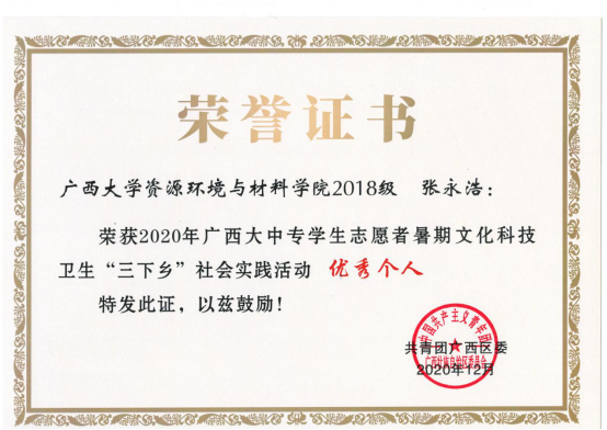 环工182班张永浩同学荣获2020年广西大中专学生志愿者暑期文化科技卫生“三下乡”社会实践活动优秀个人,环工182班张永浩、谭展龙、雷杰如同学的《关于刘家沟村精准扶贫的调查研究》报告荣获2020年广西大中专学生志愿者暑期文化科技卫生“三下乡”社会实践活动优秀调研报告三等奖。他们利用2020年暑期对山东省日照市刘家沟村当地的精准扶贫工作进行了深入调研,结合实际情况与学所知识,撰写出了高质量的调研报告,为当地扶贫工作出谋献策。