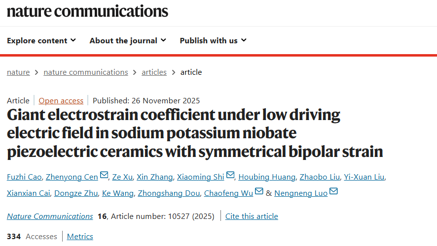 科研团队研发出具备超低驱动电场和巨应变系数的铌酸钾钠无铅压电材料,性能超越当前主流的铅基压电体系,在高精度微型器件应用领域上展现出巨大的潜力。该成果以 “Giant electrostrain coefficient under low driving electric field in sodium potassium niobate piezoelectric ceramics with symmetrical bipolar strain”为题,发表在国际知名期刊《自然·通讯》(Nature Communications, 2025, 16, 10527.)上。快看漫画